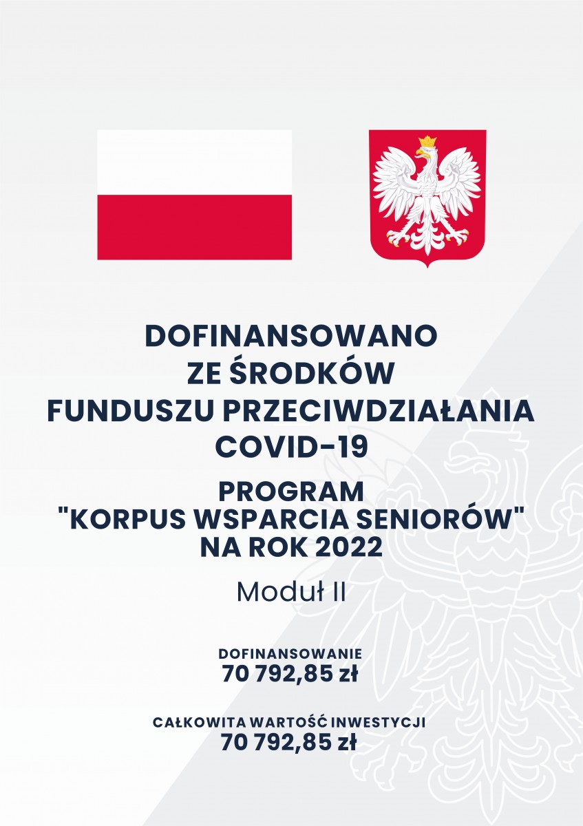 Program finansowany w całości ze środków z Funduszu Przeciwdziałania COVID-19, utworzonego na podstawie art. 65 ustawy z dnia 31 marca 2020 r. o zmianie ustawy o szczególnych rozwiązaniach związanych z zapobieganiem, przeciwdziałaniem i zwalczaniem COVID-19, innych chorób zakaźnych oraz wywołanych nimi sytuacji kryzysowych oraz niektórych innych ustaw.