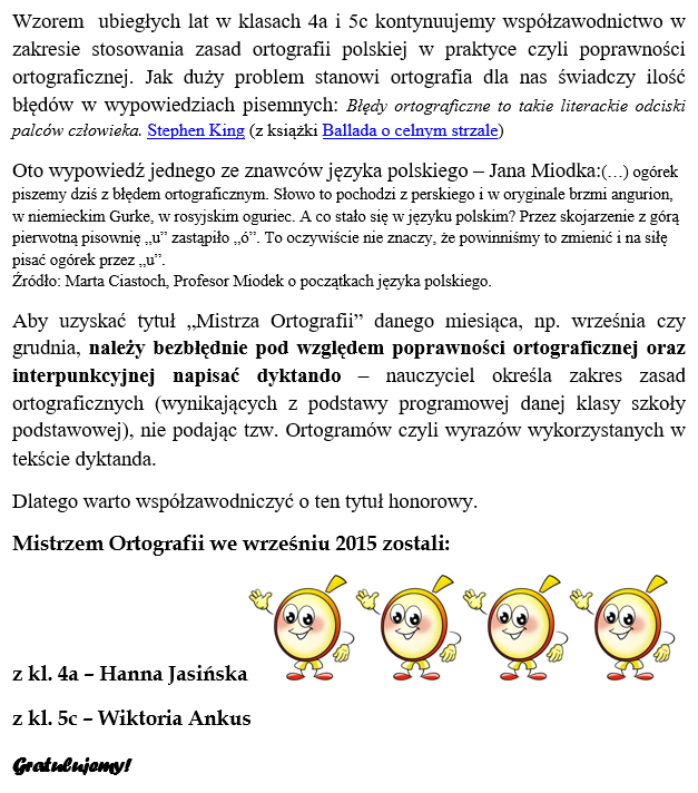 Komisja konkursowa, złożona z wytypowanych przez nauczycielkę plastyki przedstawicieli klas 4-6 wybrał Laureatów, których prace zastały wyeksponowane w holu szkoły: