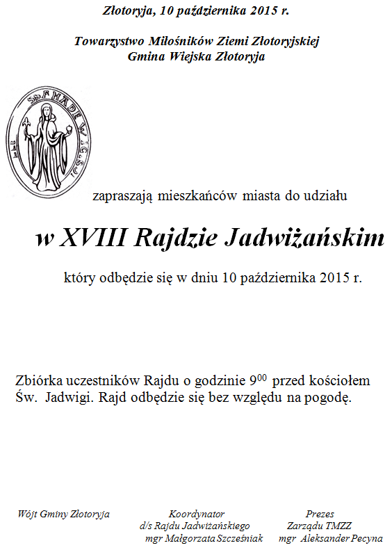 Zapraszamy Państwa wraz z uczniami do udziału w XVIII Rajdzie Jadwiżańskim, który odbędzie się w sobotę 10 października 2015, rozpoczęcie o godz. 9.00 w kościele Św. Jadwigi w Złotoryi. Towarzystwo Ziemi Złotoryjskiej jak co roku organizuje rajd wspólnie z Gminą Złotoryja. Program rajdu w załączniku i zostanie przeprowadzony bez względu na warunki pogodowe.