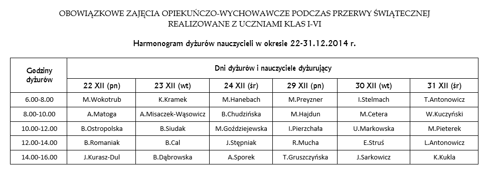 Przypominam, że w dniach 2.01.2015 r. (pt.) i 5.01.2015 r. (pn.) nasza szkoła nie realizuje zajęć dydaktycznych, jedynie dla dzieci wymagających opieki organizuje zajęcia świetlicowe.