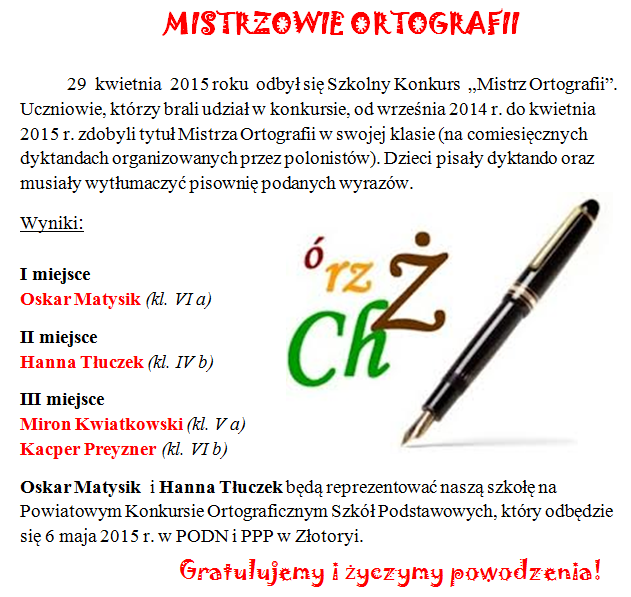 Uczniowie przechodzą do kolejnego etapu konkursu, wezmą udział w POWIATOWYM KONKURSIE – MISTRZ TABLICZKI MNOŻENIA w dniu 22 kwietnia 2015r. w Szkole Podstawowej nr 1 w Złotoryi.
